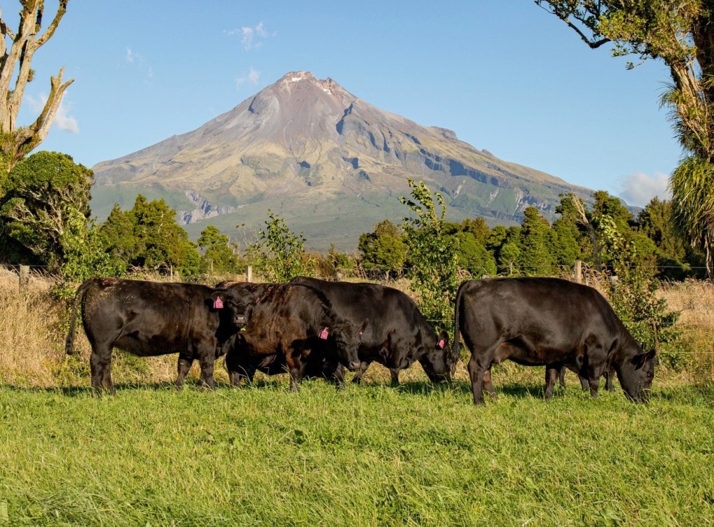 Part of the Kaitake Lowline Stud herd thriving in nature under the careful watch of Mount Egmont, Taranaki