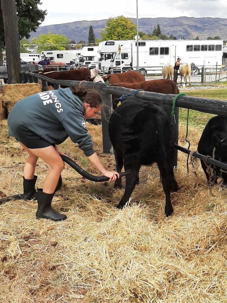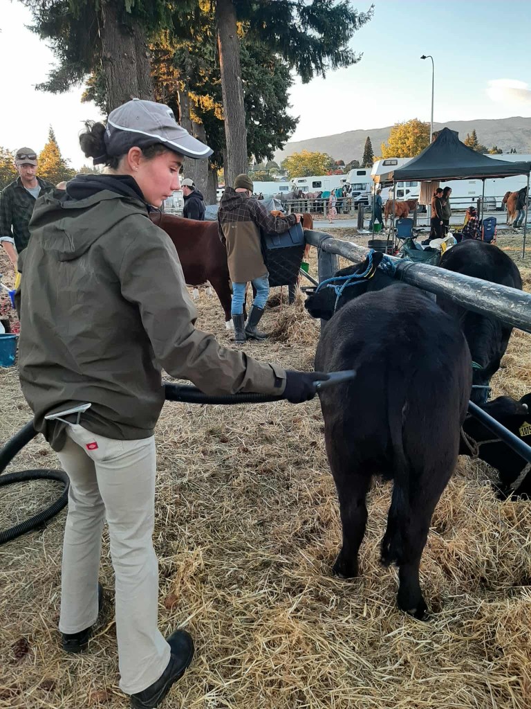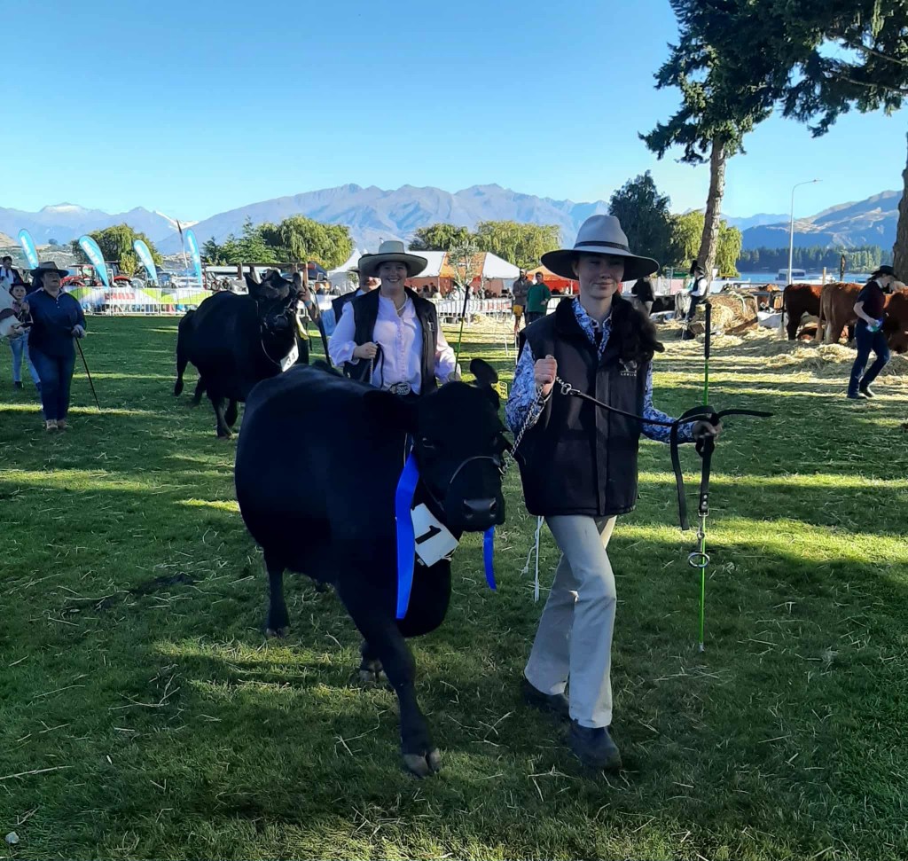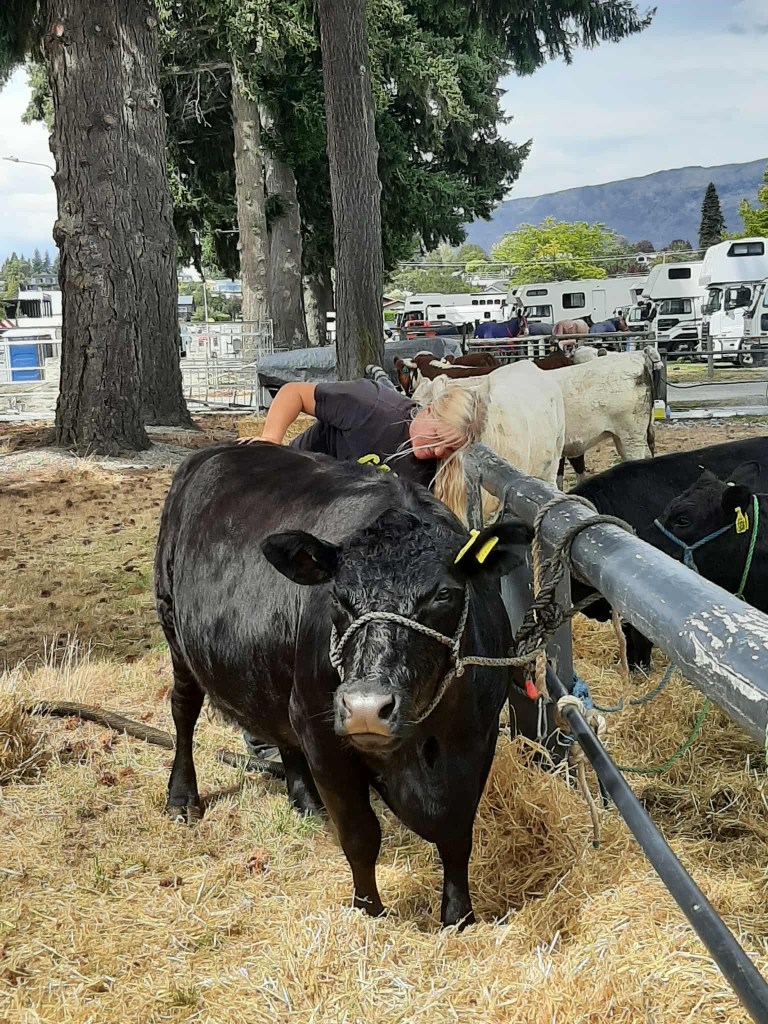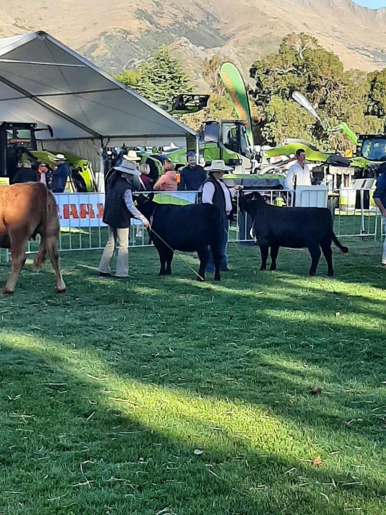 A good lineup of cattle breeds – South Devon, Angus, Murray Grey, Galloway, Speckle Park, Hereford, Charolais – and a first for Wanaka – Lowline. Very chuffed to come away with a second ribbon in the older cow with calf class. The judge, PJ Budler, from South Africa, said she had the best udder at the show. She was just edged for first in the class by a Galloway because the Galloway calf was bigger.